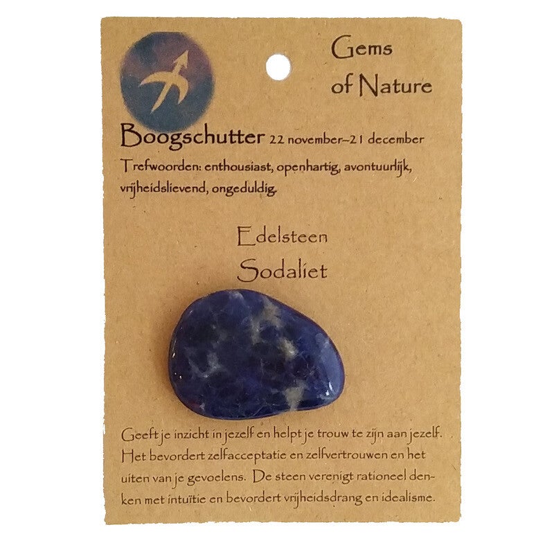 Edelsteen: Sodaliet. Geeft je inzicht in jezelf en helpt je trouw te zijn aan jezelf. Het bevordert zelfacceptatie en zelfvertrouwen en het uiten van je gevoelens. De steen verenigt rationeel denken met intuïtie en bevordert vrijheidsdrang en idealisme.
