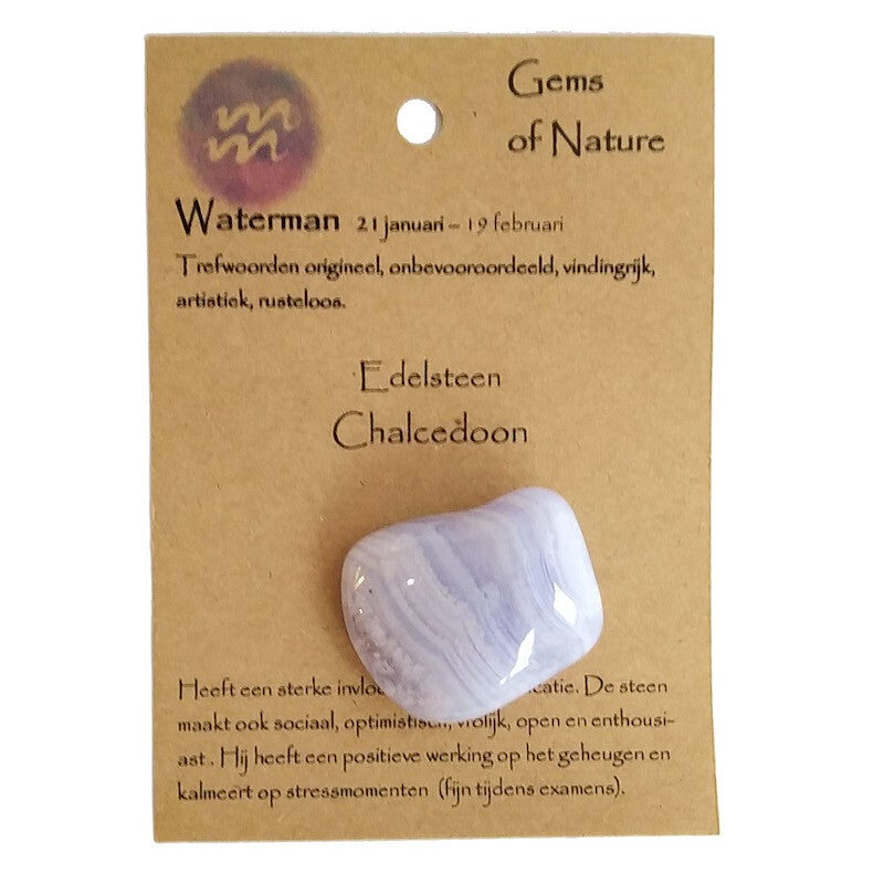 Edelsteen: Chalcedoon. Heeft een sterke invloed op de communicatie. De steen maakt ook sociaal, optimistisch, vrolijk, open en enthousiast . Hij heeft een positieve werking op het geheugen en kalmeert op stressmomenten (fijn tijdens examens).