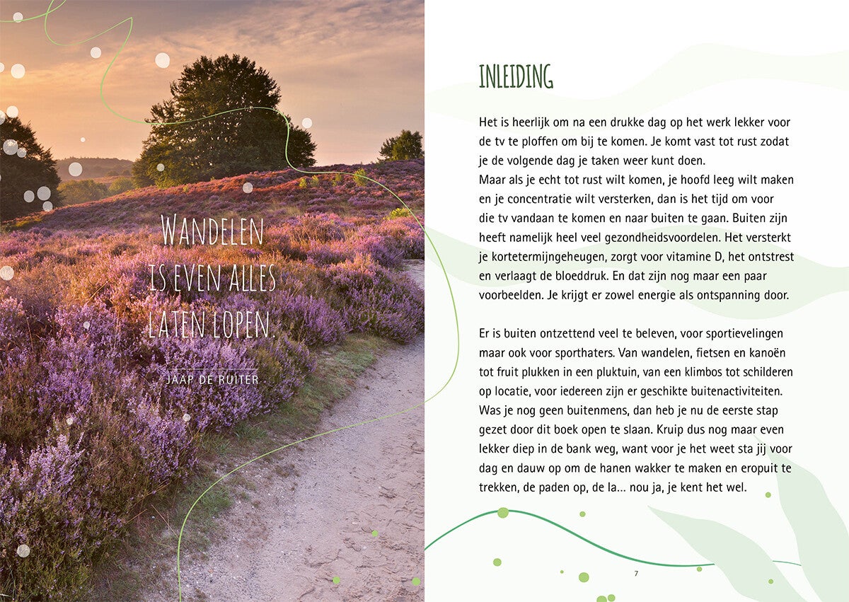 Eigenlijk weet je het wel: je zou meer naar buiten moeten. Want naar buiten gaan is gezond, het ontstrest, en er is buiten nu eenmaal meer te beleven dan binnen. Maar hoe vind je nu iets leuks om buiten te doen? Of je nu een sportieveling bent of juist helemaal niet, in dit boek vind je talloze ideeën om meer naar buiten te gaan, van een klimbos tot buitenkunst, van wandelen tot bosbaden. Ook voor jou is een activiteit te vinden die ervoor zorgt dat je meer buiten komt, zodat ook jij je kunt ontspannen en van de frisse buitenlucht kunt genieten!